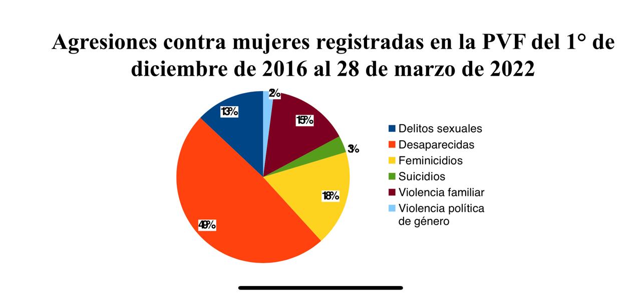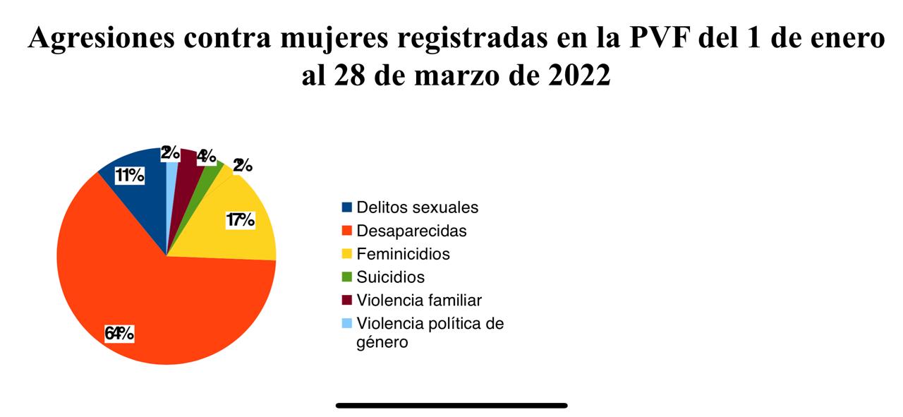 De las 203 agresiones acontecidas en lo que va de este año, 22 son reportes de delitos sexuales, 129 de desapariciones, 34 feminicidios, 5 suicidios, 9 casos de violencia familiar y 4 de violencia política de género.