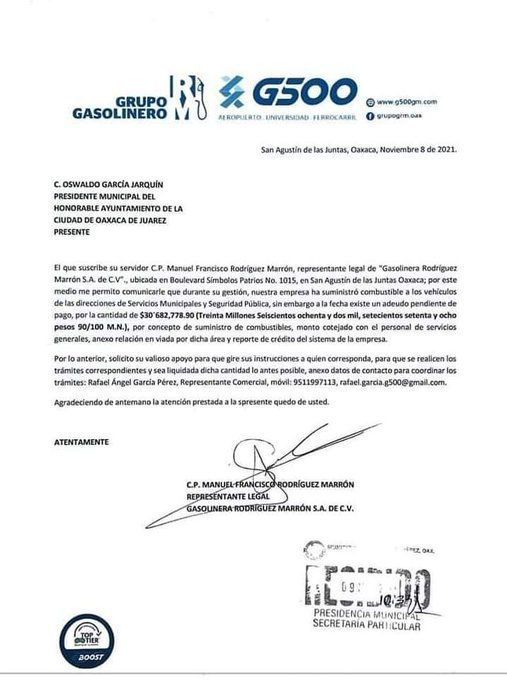 La empresa “Gasolinera Rodríguez Marrón S.A de C.V.” Ubicada en Símbolos Patrios No 1015, en San Agustin de las Juntas, informó que durante la gestión de Oswaldo García Jarquín, suministro de combustible a las unidades de la dirección de servicios municipales y de seguridad pública.