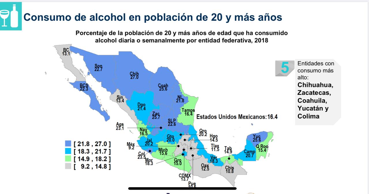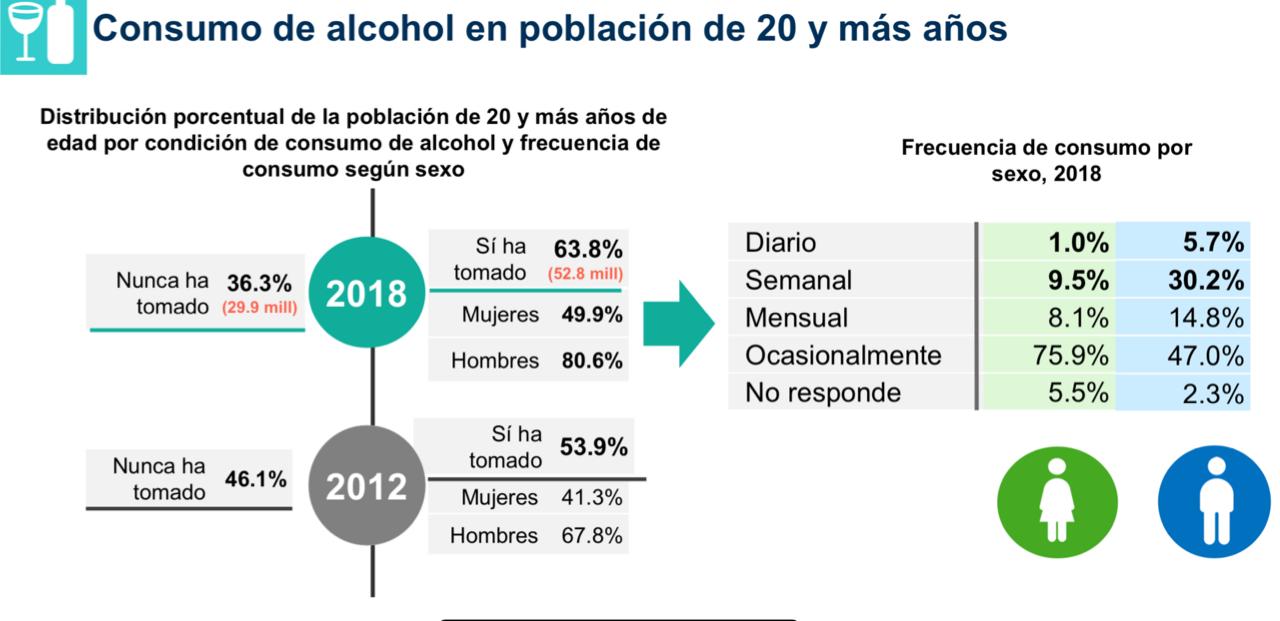 En México ha crecido el consumo de alcohol en los últimos años según datos de la Encuesta Nacional de Salud y Nutrición el consumo de alcohol en México pasó del 53.9% en el 2012 al 63.8% en el 2018, de los cuales se ha elevó en los hombres del 67.8% al 80.6% mientras que en las mujeres pasó del 41.3% al 49.9%