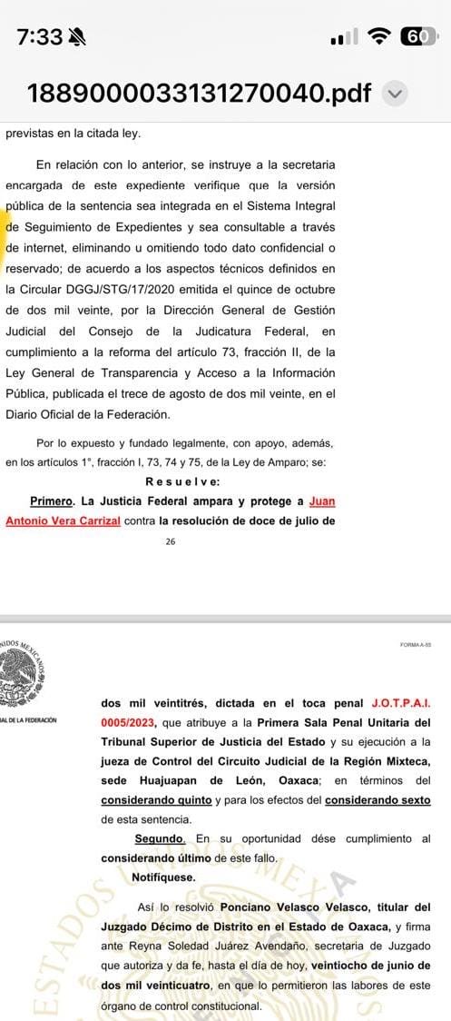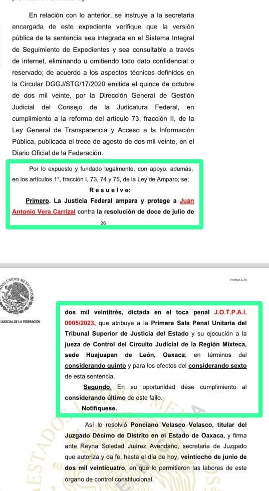 En un giro significativo en el caso que ha captado la atención nacional, el titular del Juzgado Décimo de Distrito en el Estado de Oaxaca, Ponciano Velasco Velasco, concedió este martes un amparo al empresario Juan Manuel Vera Carrizal. La decisión se fundamenta en el rebaso del plazo de prisión preventiva de dos años, sin que se haya concluido el procedimiento penal en su contra.