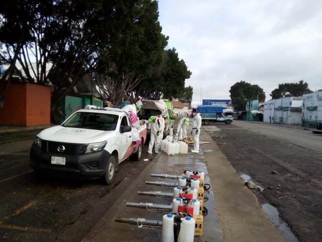Este domingo 7 de junio, se realiza la sanitización de la zona norte del citado centro de comercio, así como la zona de bodegas, en donde participan 1 jefe y 11 elementos, con el siguiente equipo: 11 termonebulizadoras con capacidad de 16 litros, así como 10 bombas aspersoras con capacidad de 25 litros y tres vehículos
