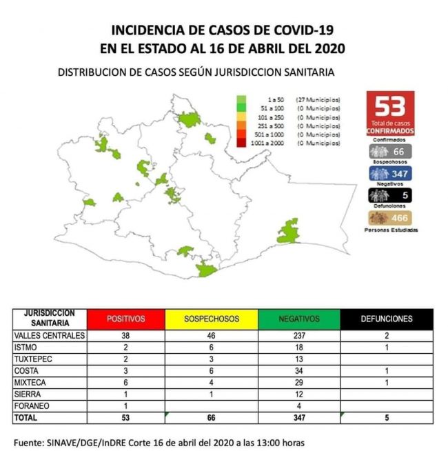 En Oaxaca fueron detectados 3 nuevos casos positivos de Covid-19, con lo que suman 53 pacientes confirmados, 66 casos sospechosos en espera de resultados y 347 negativos, lo que resulta en 466 notificaciones y 5 defunciones.
