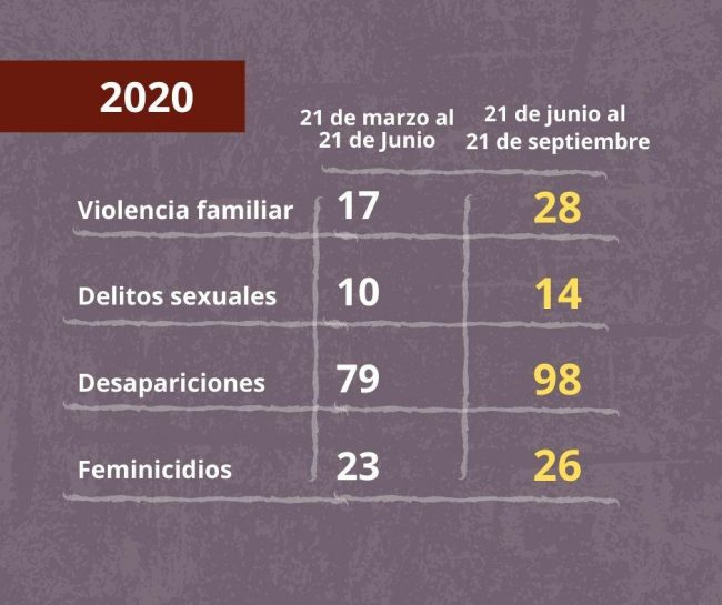 • Los casos de violencia familiar aumentaron 65%, 28 casos en comparación con 17 registrados tres meses antes, y la violencia sexual incrementó 40%, 14 casos en comparación con 10 registrados en el trimestre anterior.