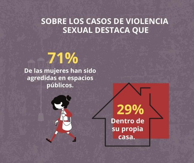 Respecto a los casos de violencia sexual destaca, dentro del mismo periodo, que 71% de las mujeres han sido agredidas en espacios públicos (10 casos) y el 29% dentro de su propia casa (4 casos).