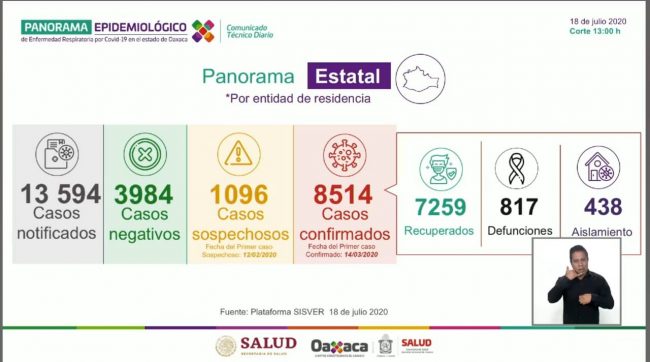 En Oaxaca se registró un aumento de 140 casos llegando a un total de 8 mil 514 positivos, los sospechosos son 1, 096 y la cifra de fallecidos es de 817, ocho más respecto al día de ayer.