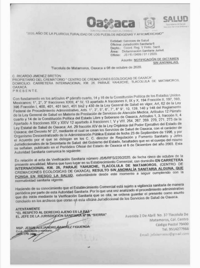 Y es que a pesar de que en el oficio emitido por la jurisdicción sanitaria numero 6, de la Secretaría de los Servicios de Salud de Oaxaca, el propietario del lugar es Ricardo Jimenez Bretón y el crematorio se denomina “Centro de Cremaciones Ecológicas de Oaxaca”, en el lugar no cuentan con señalamientos de identificación y solo se medio construyó con bardas de láminas.