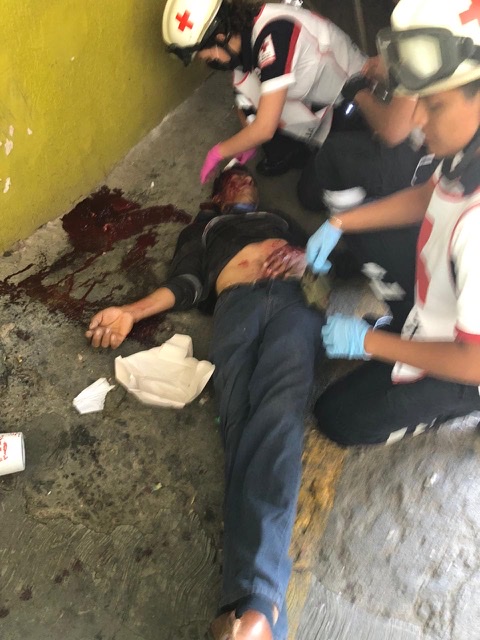 Por la cercanía de la Cruz Roja de inmediato se aproximaron paramédicos al lugar brindándole los primeros auxilios y trasladando al lesionado al Hospital Civil donde su estado de salud se reporta como grave, hasta el momento se desconoce el nombre de la persona agredida así como su procedencia testigos indicaron que llegó al estacionamiento y se sentó Para esperar a que saliera el próximo taxi a Zimatlán.