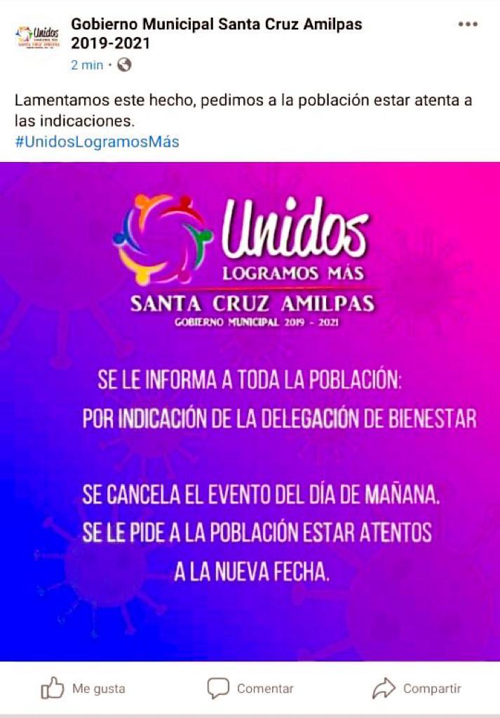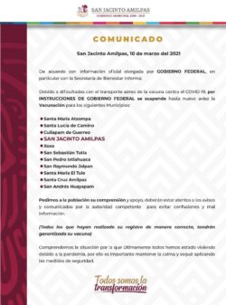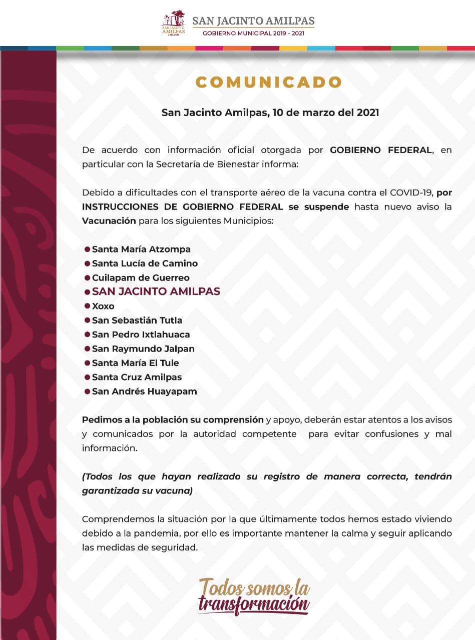 En Santa Cruz Xoxocotlán, Santa María Atzompa, San Jacinto Amilpas, Santa Cruz Amilpas y Santa María el Tule, han emitido el comunicado donde señalan que fue Bienestar federal y estatal quienes no entregaron los biológicos.