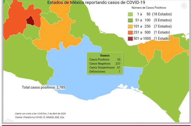 En el caso de Oaxaca se han registrado hasta el momento 35 casos positivos, 61 casos sospechosos y 1 defunción.