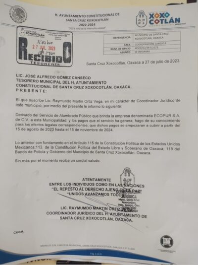 Santa Cruz Xoxocotlán, Oaxaca— La crisis financiera y administrativa en Santa Cruz Xoxocotlán podría alcanzar un nuevo nivel en los próximos días, cuando el municipio enfrente un posible apagón del alumbrado público debido a la negativa del presidente municipal saliente, Inocente “Chente” Castellanos, de cubrir una deuda millonaria por el suministro de energía. La presidenta municipal electa, Nancy Benítez, heredará una deuda cercana a los 8 millones de pesos si Castellanos no asume su responsabilidad y utiliza los recursos federales etiquetados para este fin.
