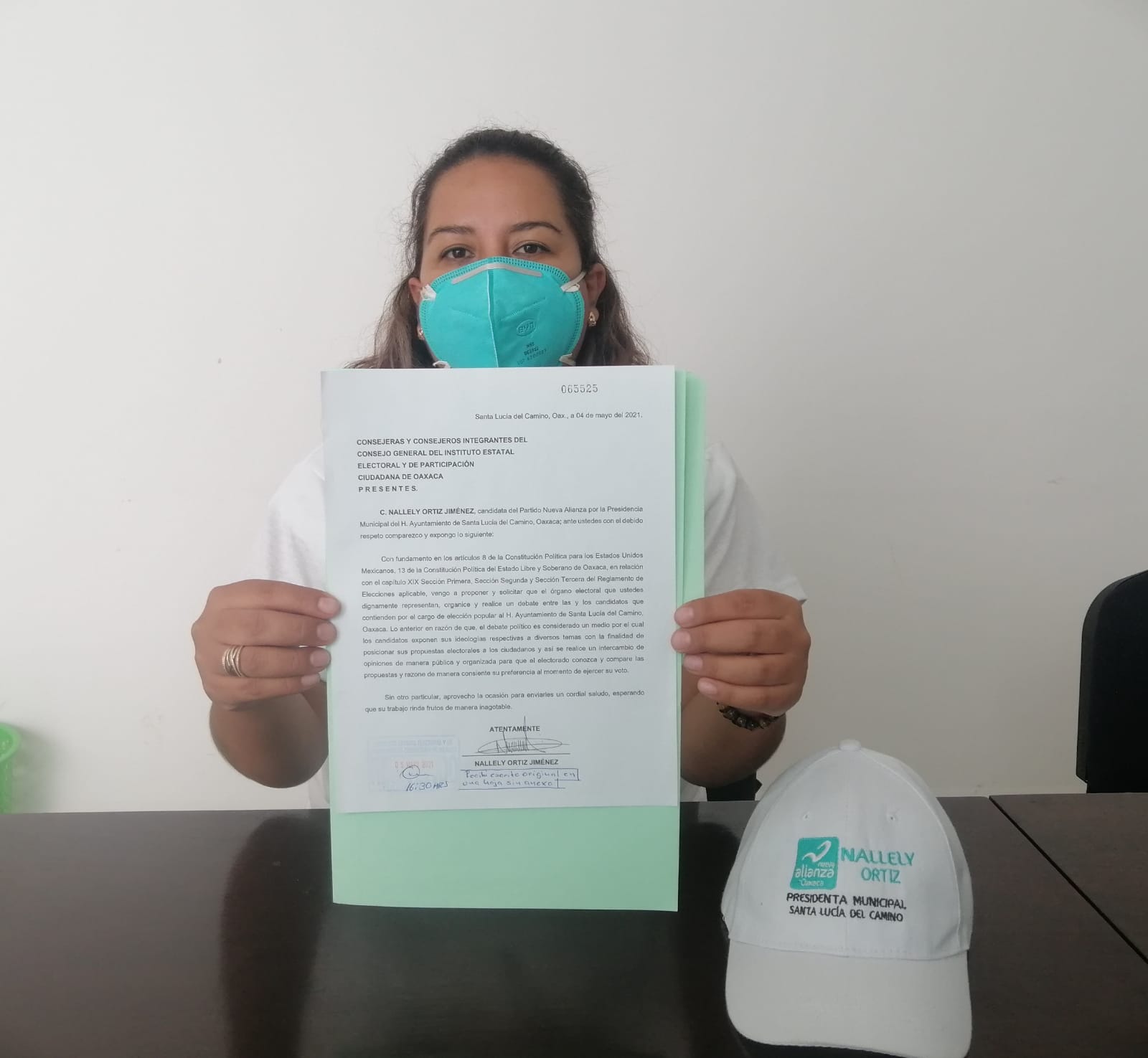 Ante el Instituto Estatal Electoral y de Participación Ciudadana (IEEPCO) la aspirante a la alcaldía de Santa Lucía del Camino, por el Partido Nueva Alianza, solicitó se realice un debate político entre las y los candidatos a la Presidencia, por ello entregó por escrito esta petición como derecho ciudadano y derecho político.