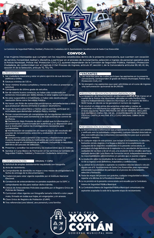 SANTA CRUZ XOXOCOTLÁN, OAX.- El H. Ayuntamiento de Santa Cruz Xoxocotlán, que encabeza el Dr. Chente Castellanos, convoca a mujeres de 18 a 34 años de edad a formar parte de la Comisión de Seguridad Pública, Vialidad y Protección Ciudadana.