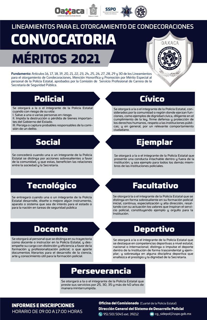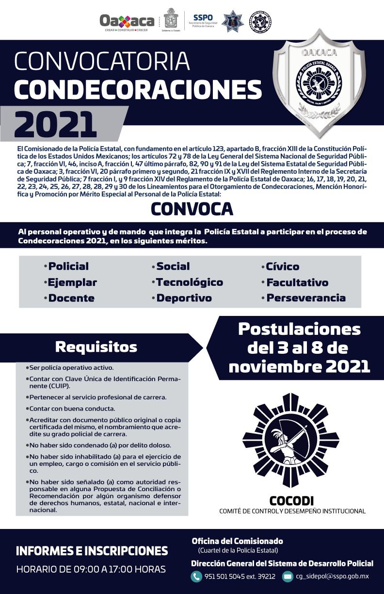 La Secretaría de Seguridad Pública de Oaxaca (SSPO), que encabeza Heliodoro Díaz Escárraga, presentó la “Convocatoria para participar en el proceso de condecoraciones 2021”, dirigida a personal operativo y de mando que integran la Policía Estatal.