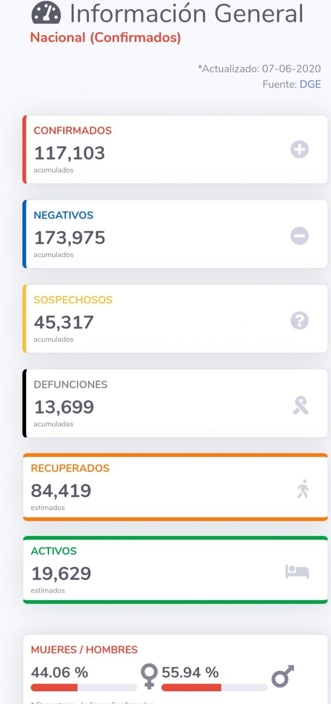 El corte al día de hoy domingo 7 de junio la Secretaría de Salud (Ssa) informó que hasta el momento en México se cuenta con 117 mil 103 casos positivos, 45 mil 317 sospechosos y 13 mil 669 defunciones.