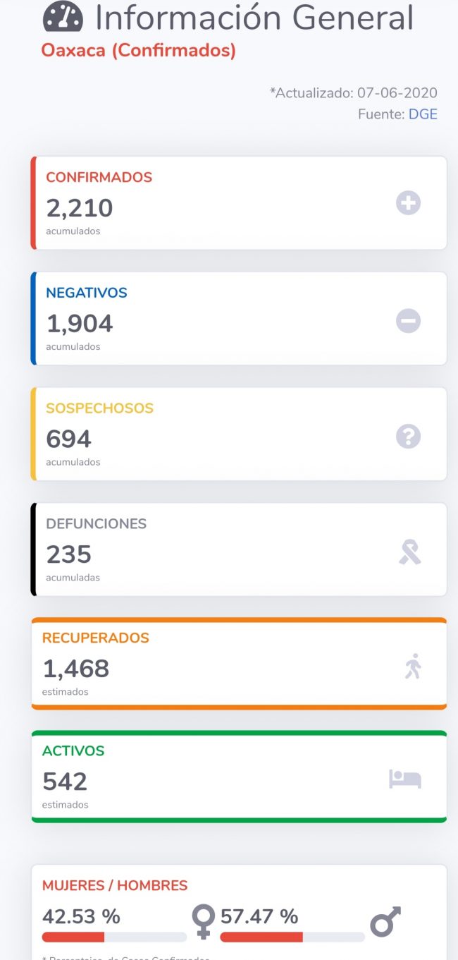 En Oaxaca se registró un aumento de 118 casos llegando a un total de 2 mil 210 positivos, los sospechosos son 694 y la cifra de fallecidos es de 235, ocho más respecto al día de ayer.