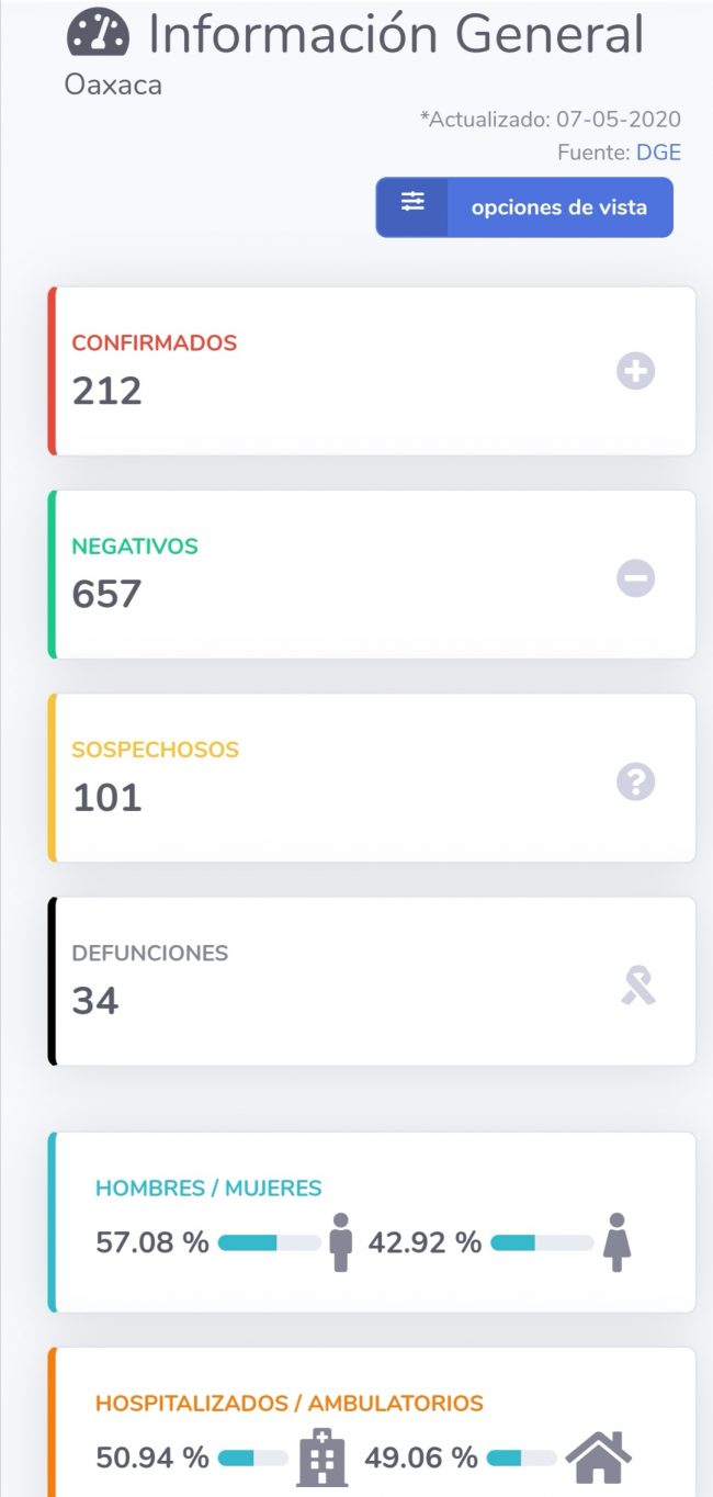 En Oaxaca los casos aumentaron en un 5% llegando a un total de CONFIRMADOS: 212; NEGATIVOS: 657; SOSPECHOSOS: 101; DEFUNCIONES: 34.