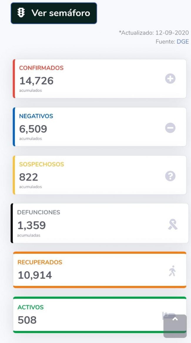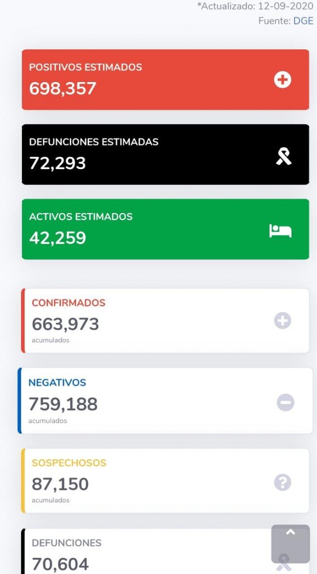 El corte al día de hoy sábado 12 de Septiembre la Secretaría de Salud (Ssa) informó que hasta el momento en México se cuenta con 663 mil 973 casos positivos, 87 mil 150 sospechosos y 70 mil 604 defunciones.