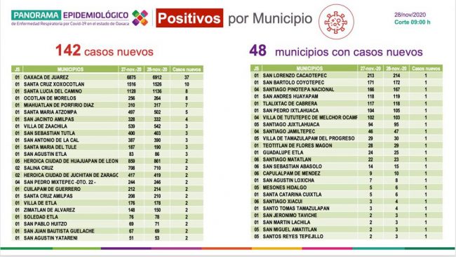 Asimismo, señaló que en las últimas 24 horas se detectaron 48 ayuntamientos con pacientes portadores del nuevo coronavirus; los municipios de Oaxaca de Juárez y Santa Cruz Xoxocotlán representan el 33% del total de nuevos contagios, al registrar 37 y 10, respectivamente.