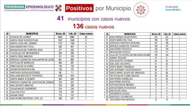 El funcionario aseveró que son 41 municipios al corte de este 1 de diciembre con la presencia de casos nuevos, con la mayor incidencia de contagios en Oaxaca de Juárez con 46 nuevos pacientes, con un total de 182 activos y un acumulado de seis mil 966 notificaciones desde el inició de la pandemia, esta zona representa el 28.4% del global de casos confirmados en todo el territorio oaxaqueño.