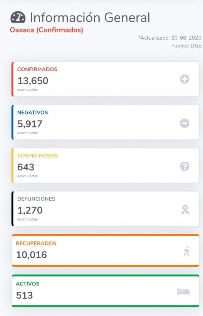 En Oaxaca se registró un aumento de 76 nuevos casos llegando a un total de 13 mil 650 positivos, los sospechosos son 643 y la cifra de fallecidos es de 1,270, ni una más respecto al día de ayer.