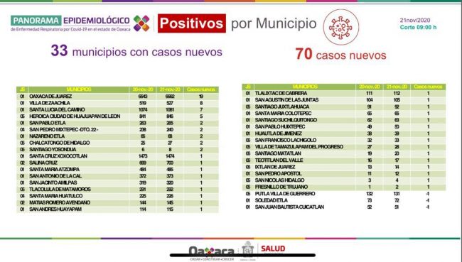 Sostuvo que los 70 casos nuevos de COVID-19 se distribuyen en 33 municipios, siendo los que mayor número de casos presentan el de Oaxaca de Juárez con 19, Villa de Zaachila con ocho, Santa Lucía del Camino con siete, Huajuapan de León con cinco, el resto entre dos y un caso.