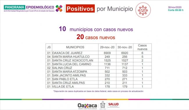 Sostuvo que los 20 casos nuevos de COVID-19, se distribuyen en 10 municipios, siendo los que mayor número de casos presentan: Oaxaca de Juárez con seis, Santa María Huatulco cinco, Santa Cruz Xoxocotlán dos y el resto un solo caso.