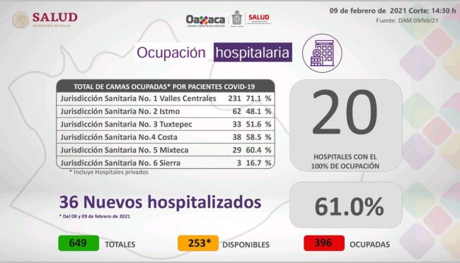 En Oaxaca se registró un aumento de 365 nuevos casos llegando a un total de 37 mil 026 positivos, los sospechosos son cuatro mil 535 y la cifra de fallecidos es de dos mil 669, seis más respecto al día de ayer.