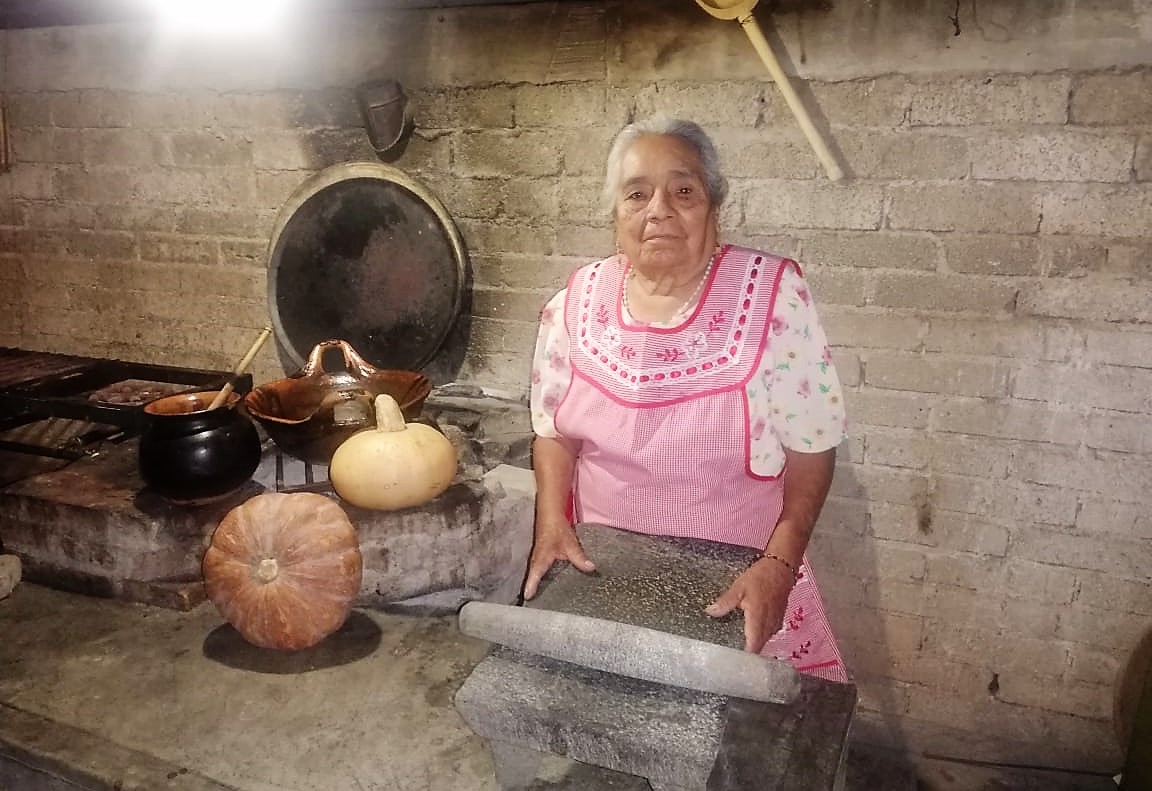Por su parte, Elodia Gómez López, originaria de Santiago Ayuquililla, región Mixteca, propuso un Pipián de frijol, “platillo que aprendí de mi mamá y que nadie más sabe preparar; yo lo guiso porque nos gusta mucho”. Está acostumbrada a sembrar y cosechar maíz, calabazas y hierbas como el epazote y hoja santa, además de moler en metate, cocinar en cazuelas de barro y con leña. “En nuestro pueblo se dedican a la fabricación de comales de barro, ahí tuesto los chiles, las semillas, los tomates”, menciona Gómez López.
