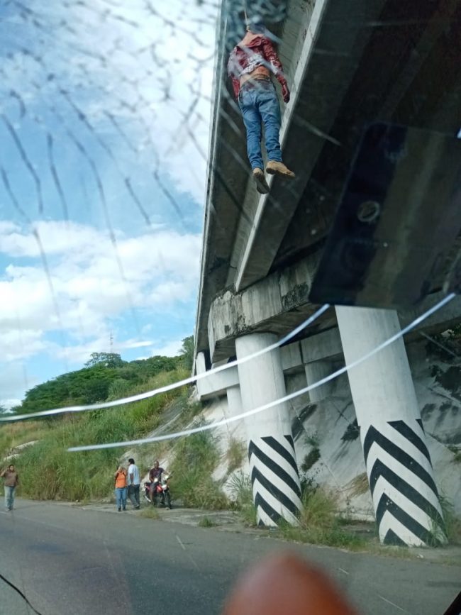 El cuerpo era de una persona del sexo masculino, quien estaba ensangrentado del rostro y parte del cuerpo, con un mecate estaba atado del cuello y pendía del puente.