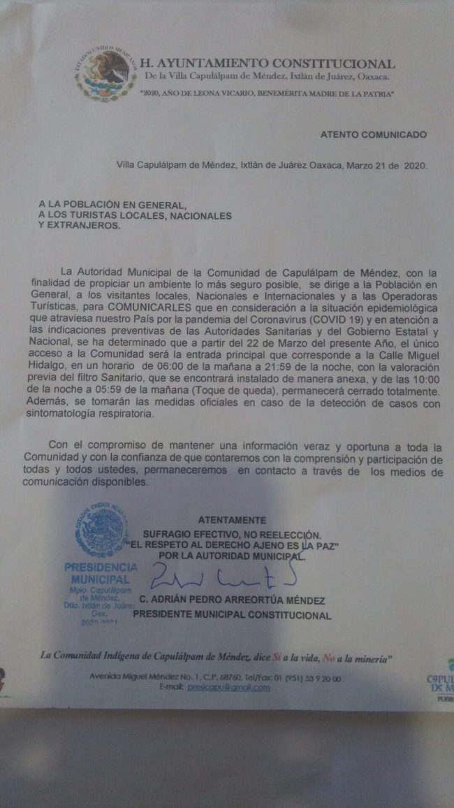 El documento firmado y sellado por parte del municipio de Capulálpam de Méndez en el distrito de Ixtlán de Juárez Oaxaca informa que en consideración a la situación epidemiológica que atraviesa el país por la pandemia del coronavirus cobit 19 y en atención a las indicaciones preventivas de las autoridades sanitarias y del gobierno del estado y gobierno federal han determinado lo siguiente