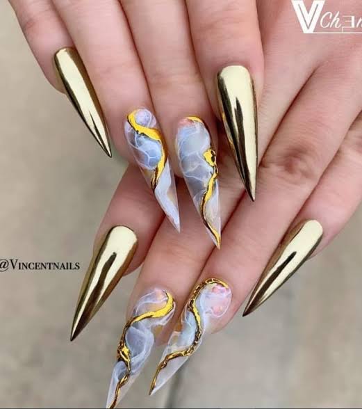 Si te gustan las uñas largas y quieres darle un toque de drama a tu mani, la forma de aguja es la ideal. Comenzando igual que la forma de almendra, este estilo termina en un punto mucho más afilado y generalmente tiene una base más ancha. Como tus uñas naturales no tendrán la fuerza suficiente para mantener esta forma, tendrás que optar por las uñas acrílicas.