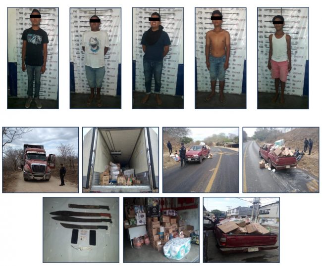 Elementos de la Policía Estatal, adscritos a la Secretaría de Seguridad Pública de Oaxaca (SSPO), detuvieron a cinco personas, dos de ellas menores de edad, quienes momentos antes habían asaltado un tráiler con mercancía de la tienda Chedraui, que circulaba en San Pedro Pochutla con dirección a Puerto Escondido.
