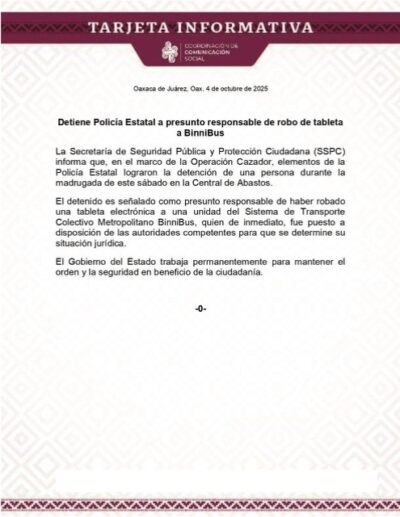 Oaxaca de Juárez, Oax., 4 de octubre de 2025.– En el marco de la Operación Cazador, elementos de la Policía Estatal detuvieron a una persona señalada como presunto responsable del robo de una tableta electrónica perteneciente al Sistema de Transporte Colectivo Metropolitano BinniBus.