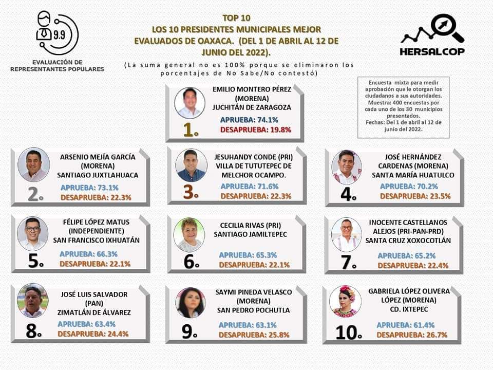 De acuerdo con la empresa consultora Hersalcop Group, el trabajo del presidente municipal de Santa Cruz Xoxocotlán, el Dr. Inocente Castellanos Alejos, es de los mejores evaluados en Oaxaca, desde el inicio de su administración.
