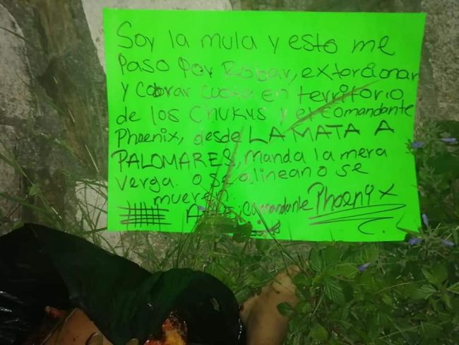 “Soy la mula y esto me pasó por robar, extorsionar y cobrar cuota en territorio de los chukys y el comandante Phoenix, desde LA MATA A PALOMARES, manda la mera Verga o se alinean o se mueren”
