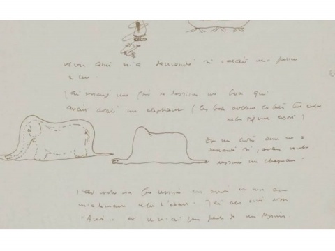 La carpeta contenía tres dibujos vinculados a El Principito -el bebedor en su planeta, la boa que digiere a un elefante acompañado de notas manuscritas, y el principito y el zorro- así como un poema ilustrado con un pequeño dibujo y una carta de amor dirigida a su mujer Consuelo.