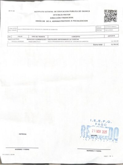 De acuerdo con documentación interna referida por personal del instituto, en solo tres días de noviembre de 2025 se habrían presentado facturas con montos elevados por servicios de alimentos y logística, entre ellos un consumo por 12 mil 760 pesos, así como un coffee break por 12 mil 180 pesos, además de otros gastos diversos que en conjunto sumarían alrededor de 50 mil pesos.