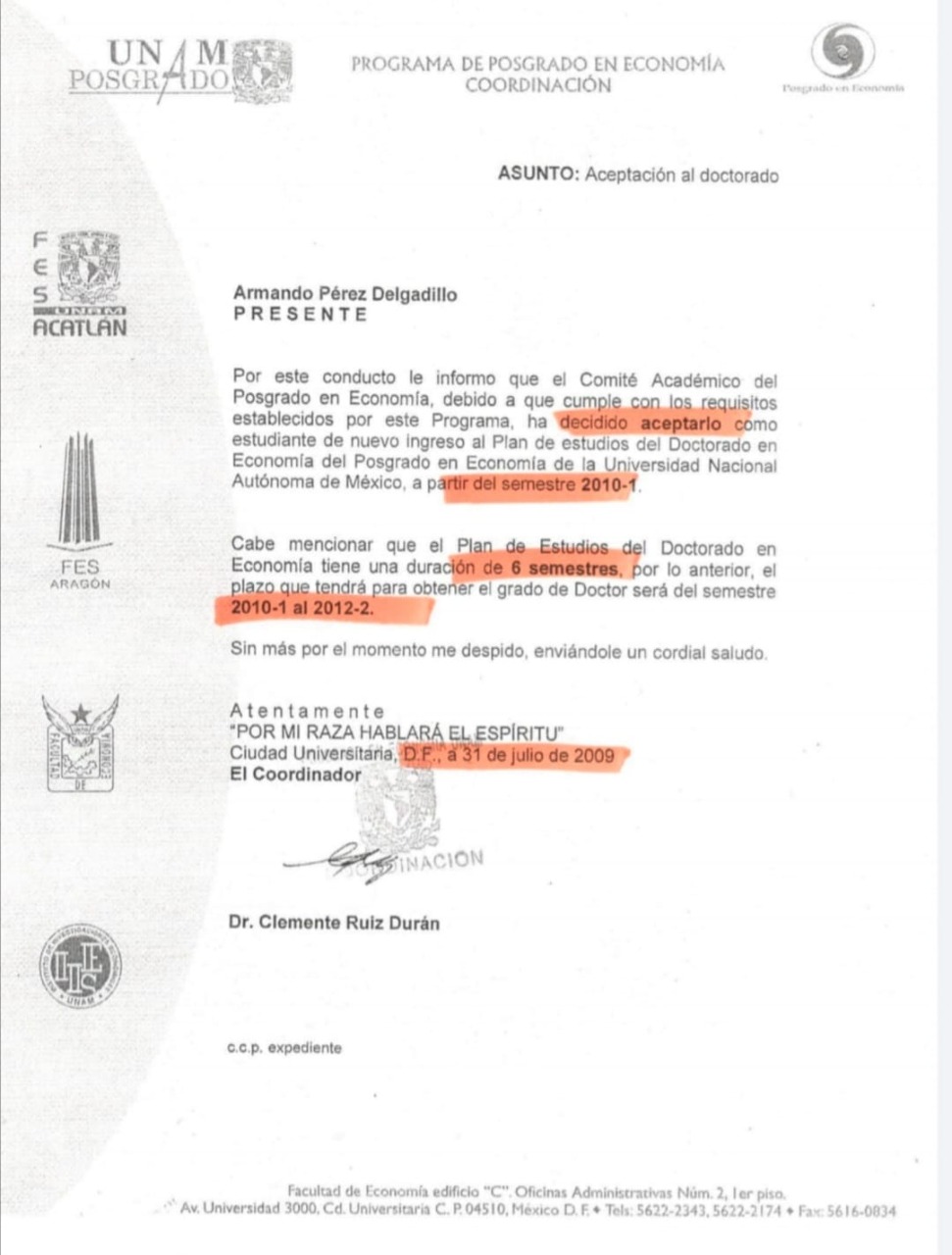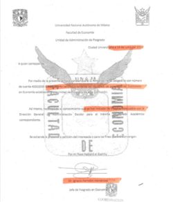Uno de ellos es el profesor de tiempo completo de la Facultad de Economía, con sueldo promedio de 10 mil pesos, Armando Pérez Delgadillo quien según su currículum en el año 2009 recibió una Carta de aceptación para el doctorado en la Universidad Nacional Autónoma de México (UNAM), para cursar el grado del año 2010 a 2012, sin embargo, en su documentación que adjunta en la UABJO, presentó una constancia con fecha de 2011, en la que indica que concluyó su doctorado en esa fecha y que además está en trámites de titulación, la cual está firmada por el Doctor, Ignacio Perrotini Hernández de quien fue becario en la Máxima Casa de Estudios Nacional.