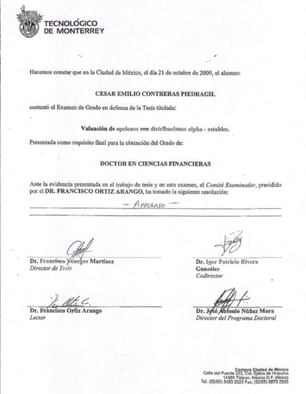 También el director de esta facultad, César Emilio Contreras Piedragil, se presenta como doctor en Ciencias Financieras, cuando en los archivos de la UABJO, sólo existe una constancia de que aprobó su examen profesional en el Tecnológico de Monterrey, sin registro de Título o Cédula.