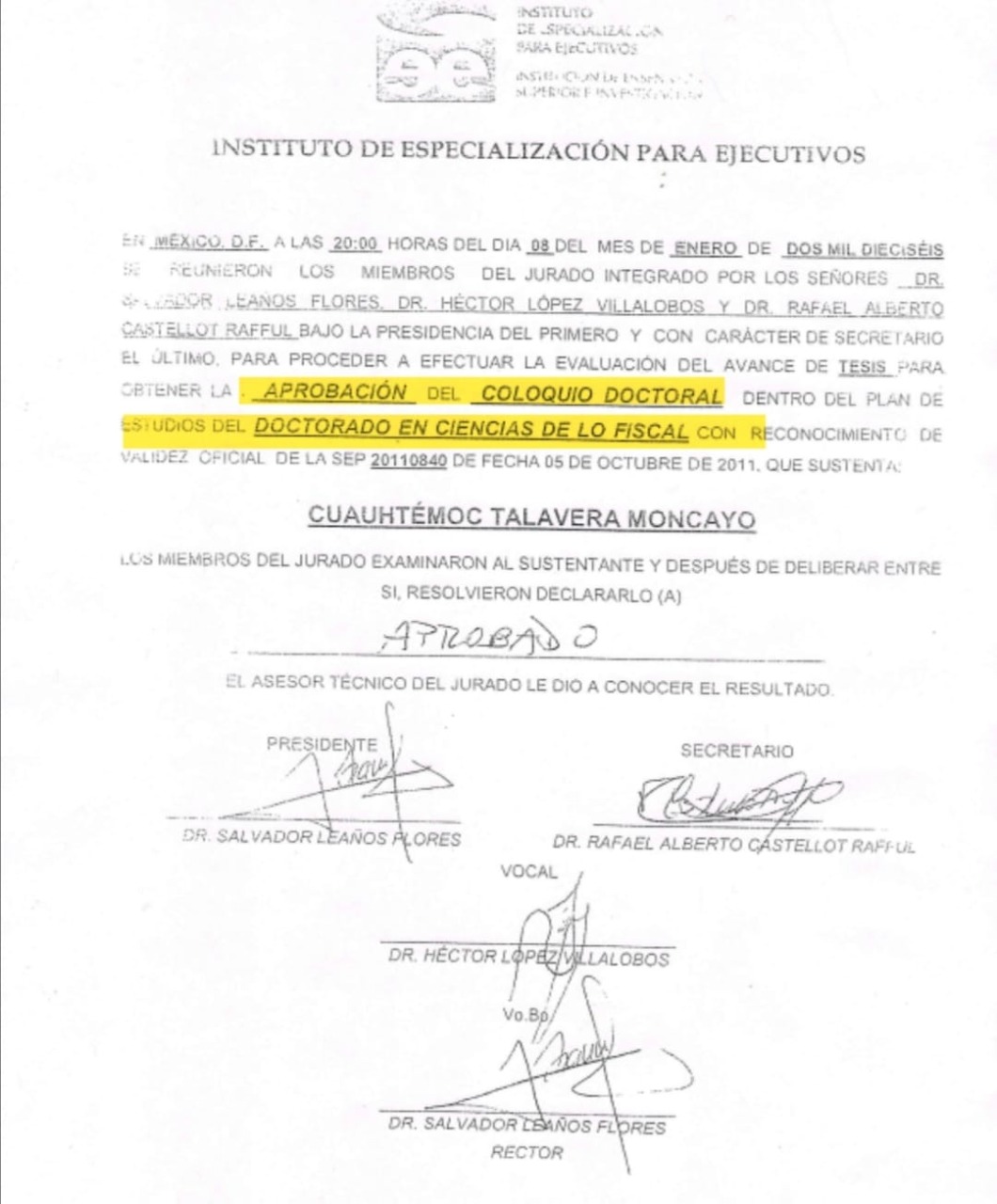 Mismo caso con el docente, Cuauhtémoc Talavera Montaño, quien a partir del año 2016 consiguió ser Profesor de Tiempo Completo al avalar su grado de doctor con una constancia de avances de tesis en un coloquio doctoral en el Instituto de Especialización para Ejecutivos, ya que tampoco se encuentra en la Dirección General de Profesiones de la SEP.