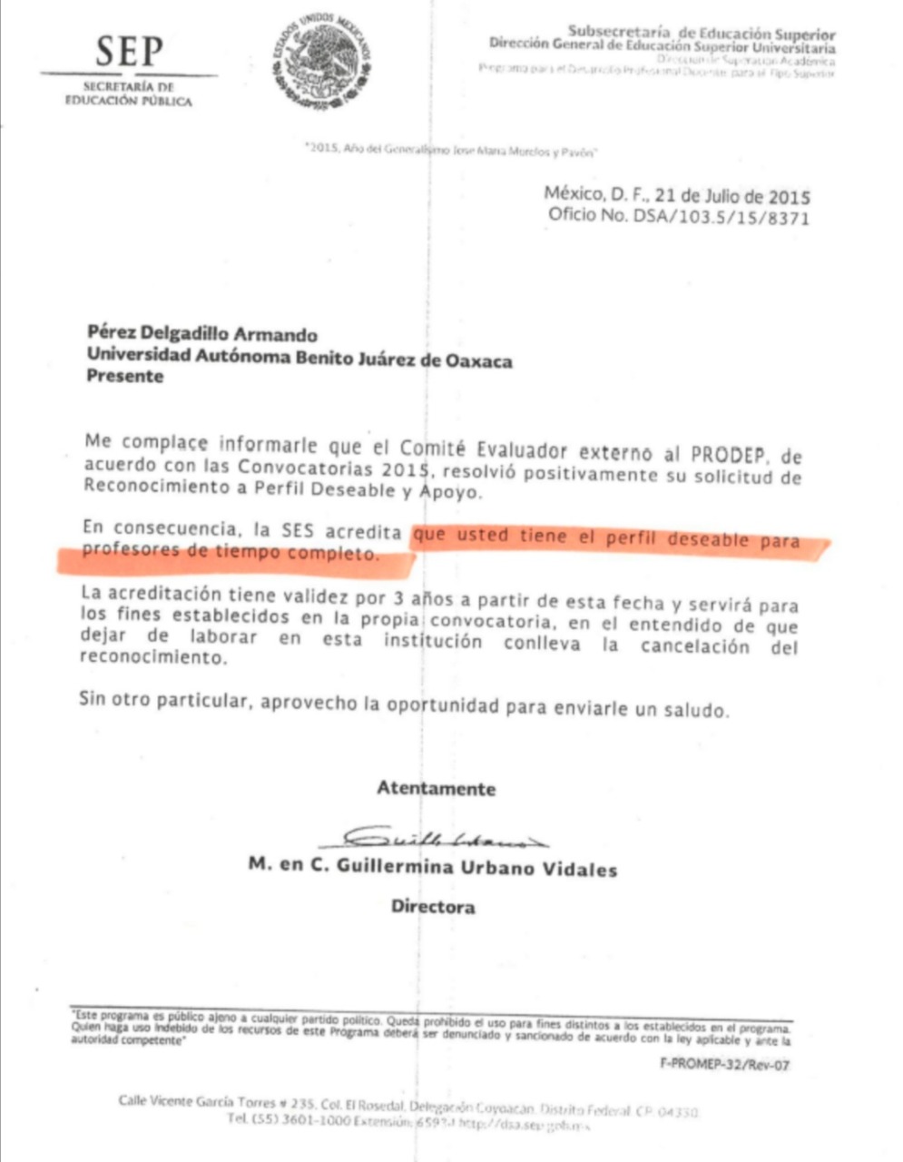 Con esta constancia irregular, se le otorgó a Armando Pérez Delgadillo su nombramiento como profesor de tiempo completo, con el cual también se postuló ante la Secretaría de Educación Pública (SEP) para recibir los estímulos económicos del programa PRODEP durante el periodo 2015-2018, mismo que ya no pudo repetir, ante la falta de un título como doctor, como lo comprueba la Dirección General de Profesiones SEP.