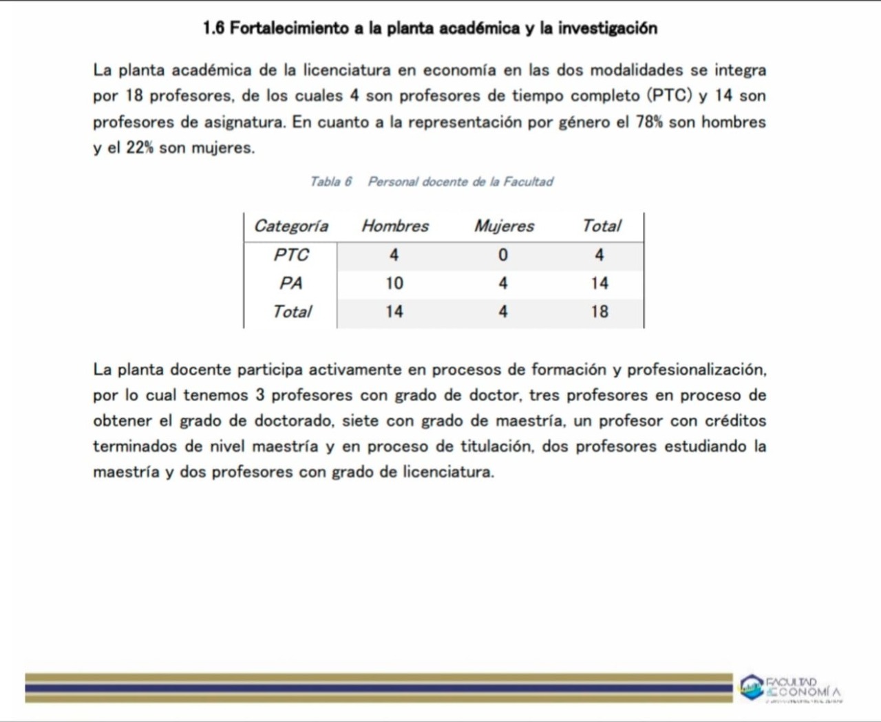 Según el último informe que presentó el director César Contreras Piedragil, correspondiente al ciclo 2018-2019 mismo que se encuentra en la página de Transparencia de la Facultad de Economía, la matrícula de alumnos en licenciatura escolarizada es de 31; por un total de 18 profesores registrados, lo que significa que existe 1 docente por cada 2 alumnos, reflejo del fracaso del Nuevo Plan de Estudios restructurado en el año 2016.