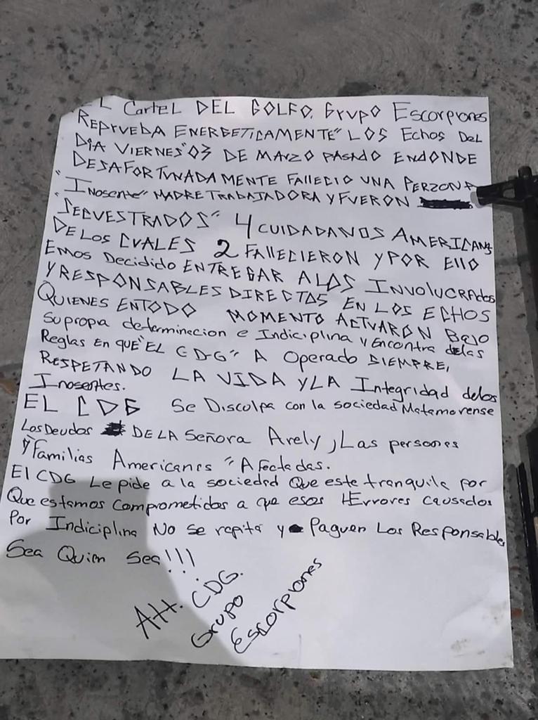 En la camioneta había una cartulina con el mensaje: “Cártel del Golfo, Grupo Escorpiones reprueba enérgicamente los hechos del día viernes 03 de marzo pasado en donde desafortunadamente falleció una persona inocente madre trabajadora y fueron secuestrados cuatro ciudadanos americanos de los cuales dos fallecieron”.