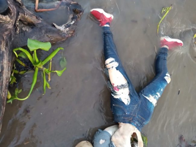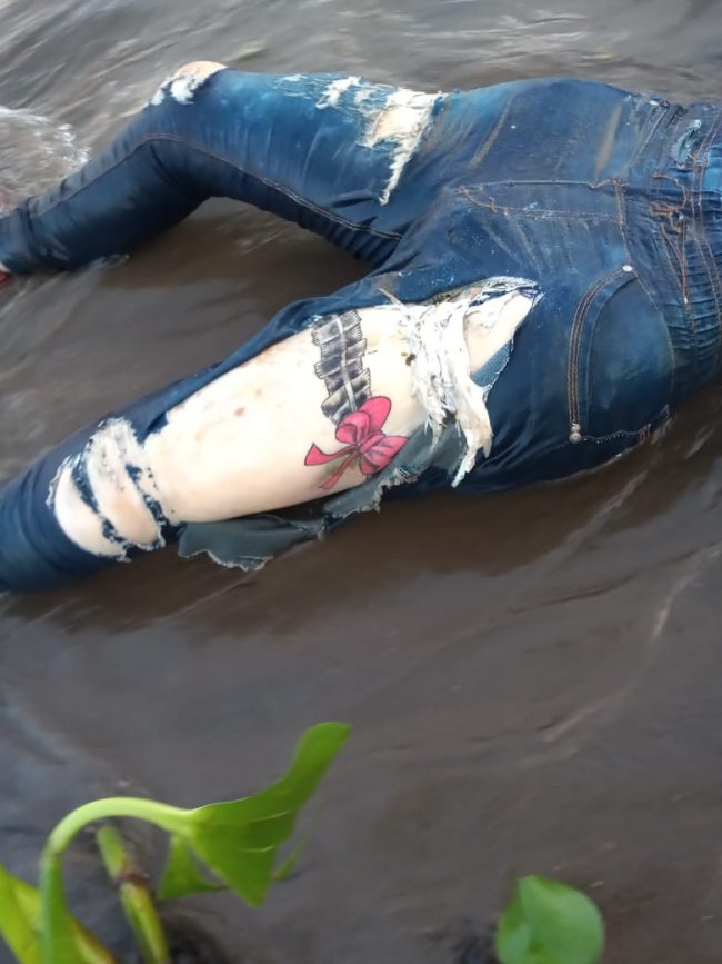 El cuerpo del sexo femenino tenía puesta una playera color gris, pantalón mezclilla color azul, tenis color rojo con el logotipo de la marca PUMA, tenía las dos manos atadas con unas agujetas hacia la parte posterior del cuerpo, de igual forma se le apreciaba a la altura de la pierna izquierda un tatuaje con la forma de un moño color rojo.