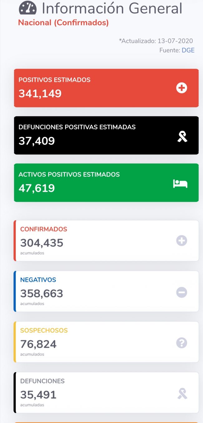 El corte al día de hoy lunes 13 de julio la Secretaría de Salud (Ssa) informó que hasta el momento en México se cuenta con 304 mil 435 casos positivos, 76 mil 824 sospechosos y 35 mil 491 defunciones.