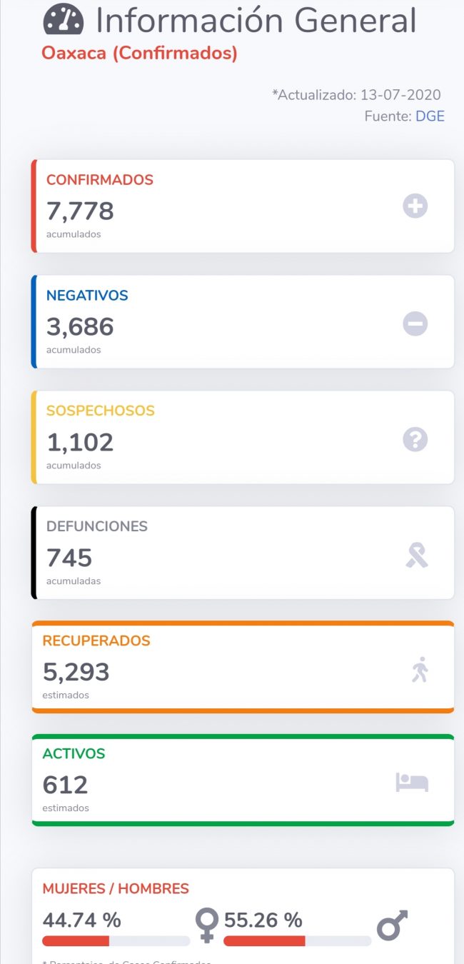 En Oaxaca se registró un aumento de 42 casos llegando a un total de 7 mil 778 positivos, los sospechosos son 1, 102 y la cifra de fallecidos es de 745, nueve más respecto al día de ayer.