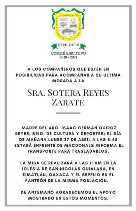Como si se tratara de un asunto oficial el entierro de una familiar del secretario de Cultura y Deportes Isaac Germán Quiroz, pidió a la base trabajadora acudir al entierro y a los delegados recolectar e ir a dejar las cuotas para entregarlos a los familiares.