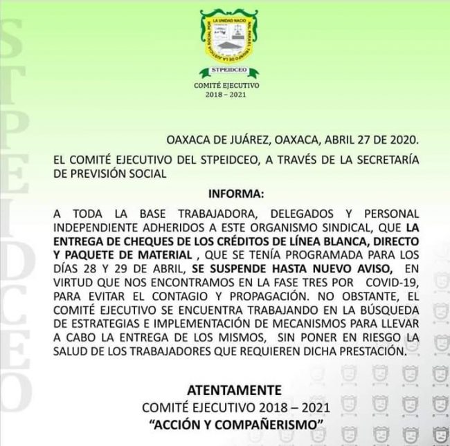 De manera incongruente horas más tarde, el líder sindical emitió otro comunicado dónde mencionó que la entrega de cheques de lo créditos de línea blanca, directo y paquete de material, queda suspendido hasta nuevo aviso