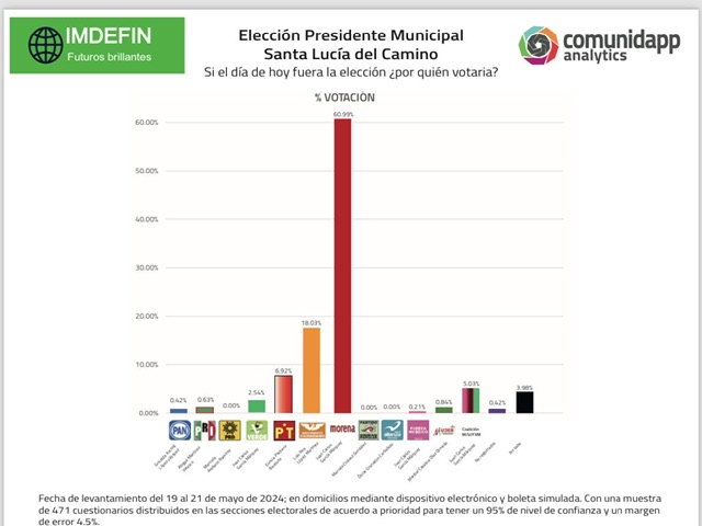 Santa Lucía del Camino, Oaxaca.- Juan Carlos García Márquez encabeza las preferencias para la elección de presidente municipal en Santa Lucía del Camino, Oaxaca, según la más reciente encuesta de la consultora especializada COMUNIDAPP, con apoyo del Instituto Mexicano de Investigación y Desarrollo Financiero (IMDEFIN).