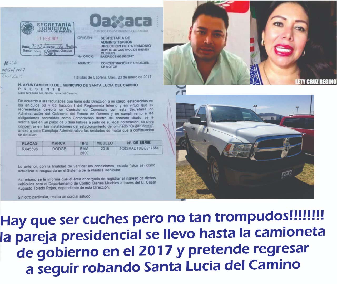 A la ex pareja presidencial del municipio de Santa Lucía también se quedó la camioneta que gobierno del estado dio en comodato al municipio